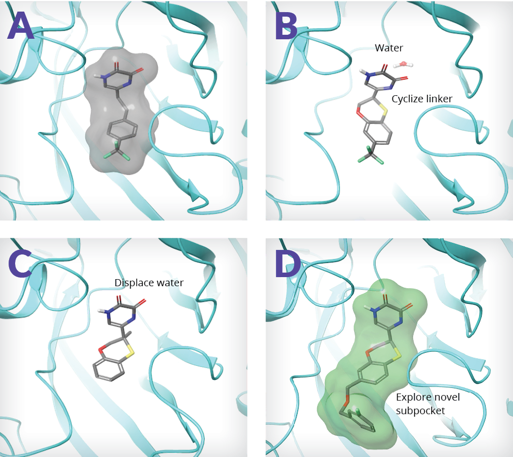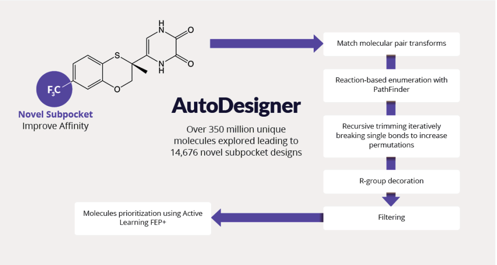 - Computationally-driven ideation and scoring workflow to amplify common enumeration strategies and screen hundreds of millions of compounds using machine learning coupled with physics-based free energy methods (FEP+, AutoDesigner)
