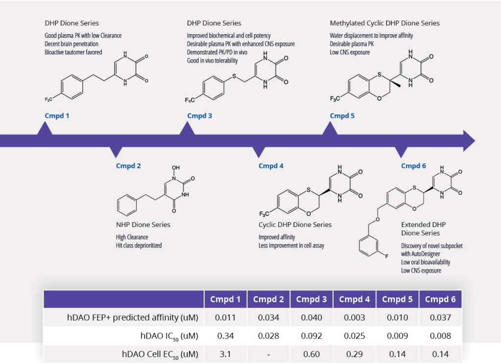 Through a computational platform rooted in creative team collaboration, highly accurate predictive modeling, and enhanced by machine learning, a promising CNS DAO inhibitor series transitioned from hit discovery to lead optimization with approximately 11,000 compounds scored by FEP+ and only 208 synthesized. Of the 208 compounds synthesized, only 20 were inactive (>10μM) against DAO. By discovering novel compounds and concurrently performing multi-parameter optimization of critical CNS properties, the team delivered high project impact for this challenging disease area.